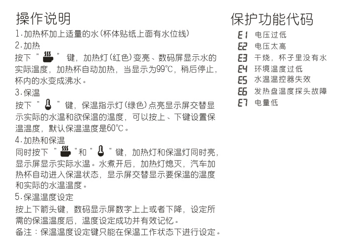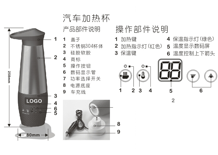 特點: 數字溫度顯示,采用厚膜加熱技術,顯著提升加熱性能,雙層不銹鋼杯體和真空保溫技術,降低熱量耗散速度,外觀采用人體工學和實用相結合的設計。