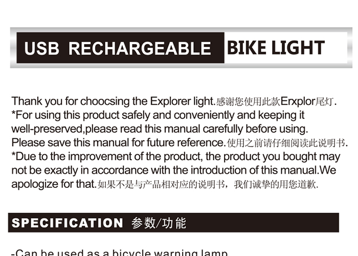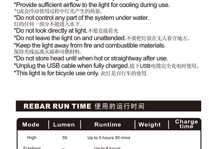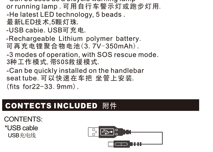 特性:LED技術,5顆大燈珠,實現(xiàn)整體流暢設計和高亮照射;同時通過脈沖模式實現(xiàn)人性化設計;配備USB接口,可循環(huán)充電;三種模式可循環(huán)切換,配有SOS模式;硅膠捆扎固定方式,方便拆卸安裝;方型背扣設計,可橫向和縱向不同角度安裝;可安裝在坐管,車把手,前叉等。