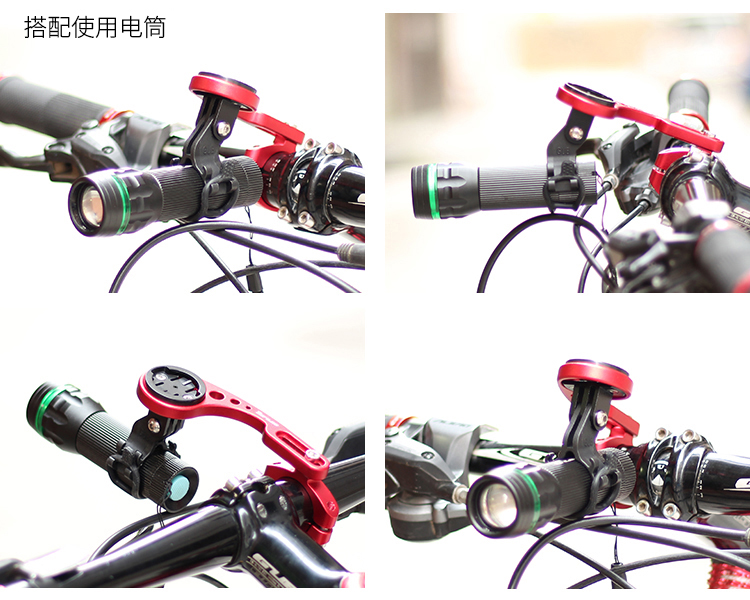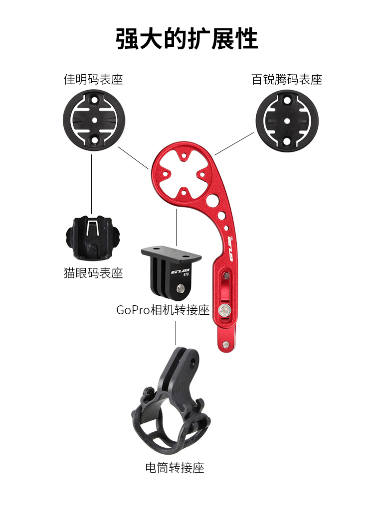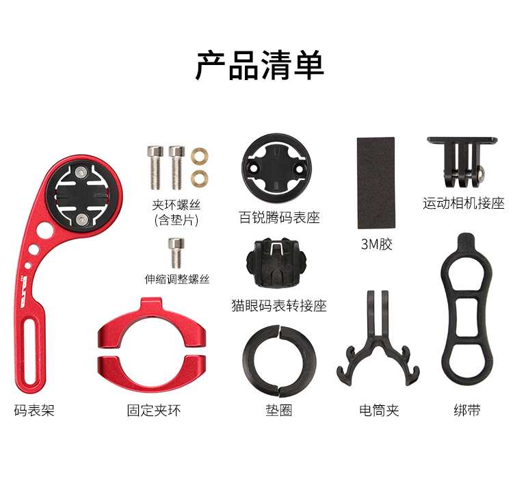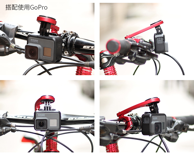 安裝在車把上,可伸縮設計,兼容佳明碼表,使用附帶的配件可兼容百銳騰碼表、貓眼碼表,另標配運動相機轉接頭和電筒轉接頭。