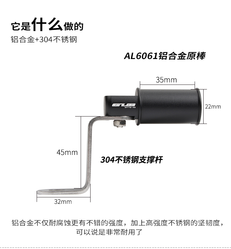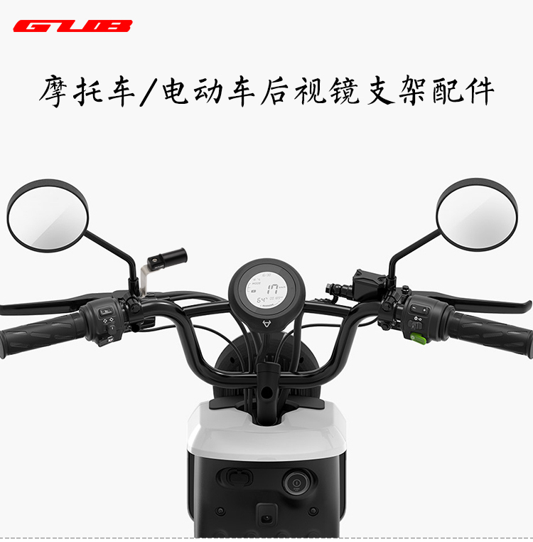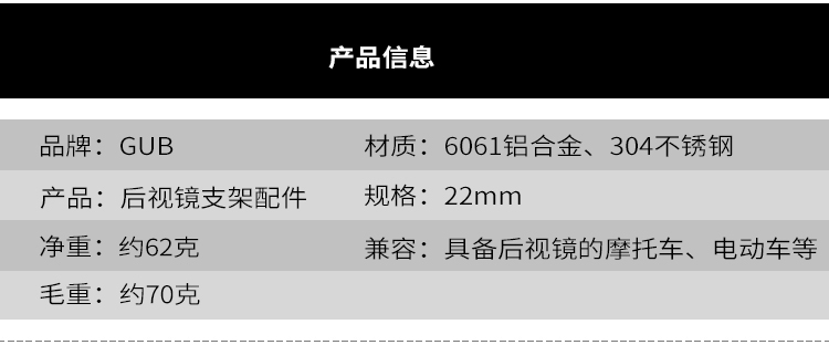名稱:GUB摩托車后視鏡支架配件 材質:AL6061鋁合金+304不銹鋼 重量:約62克(凈重),約70克(透明膠袋包裝) 統一零售價:28元