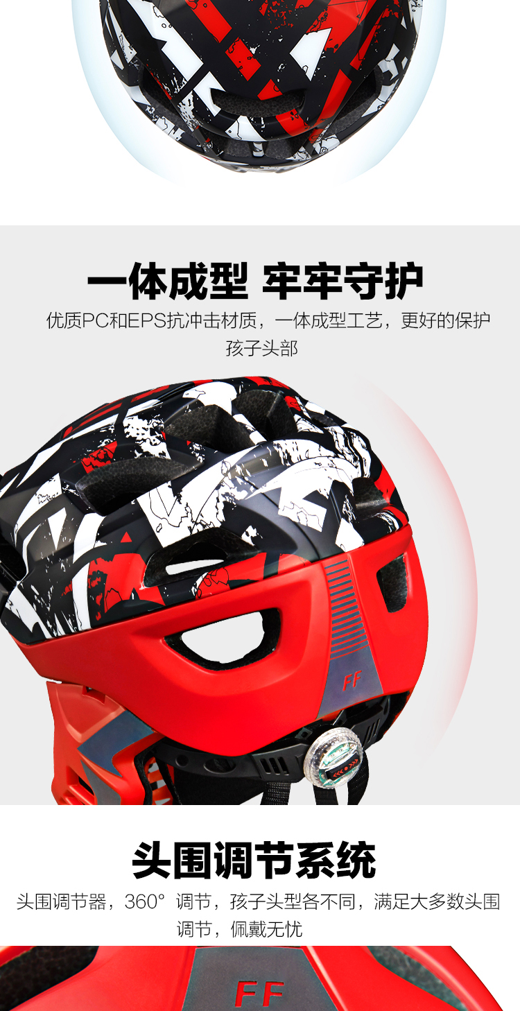 特色:全盔半盔自由切換,加長帽檐貼心保護(hù)孩子的眼睛,酷炫反光標(biāo)涂裝讓騎行更酷更有樂趣,同時頭圍調(diào)節(jié)系統(tǒng)自帶的尾燈起到警示作用,讓孩子的夜騎更安全。