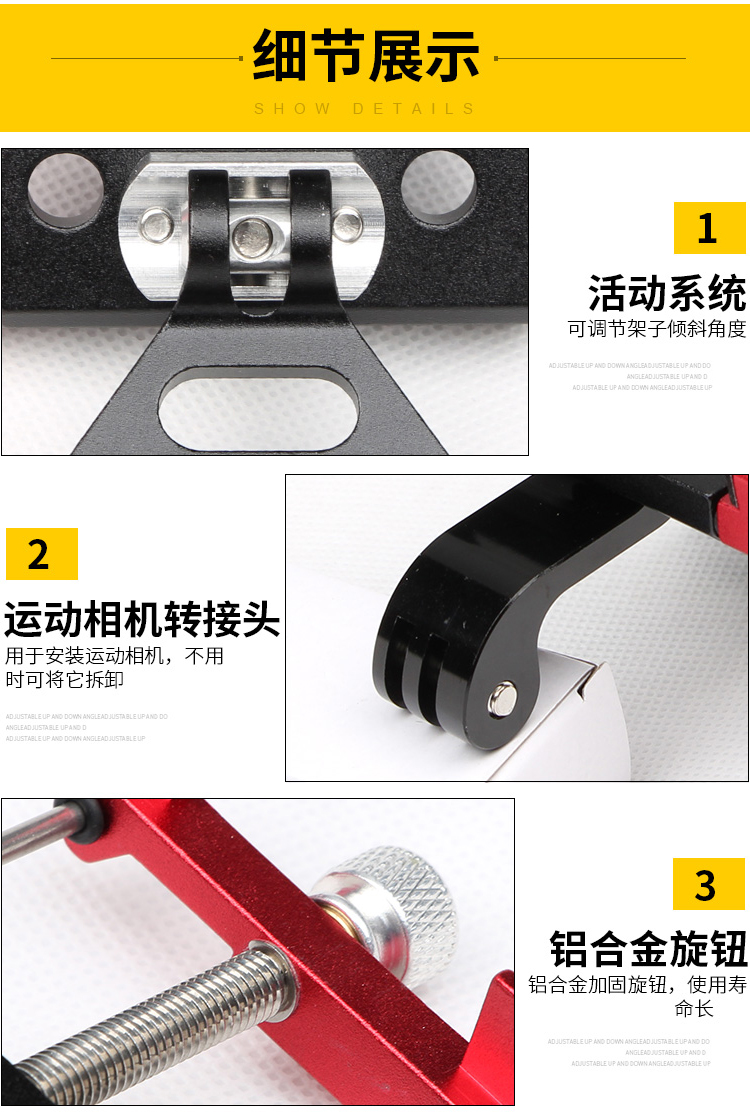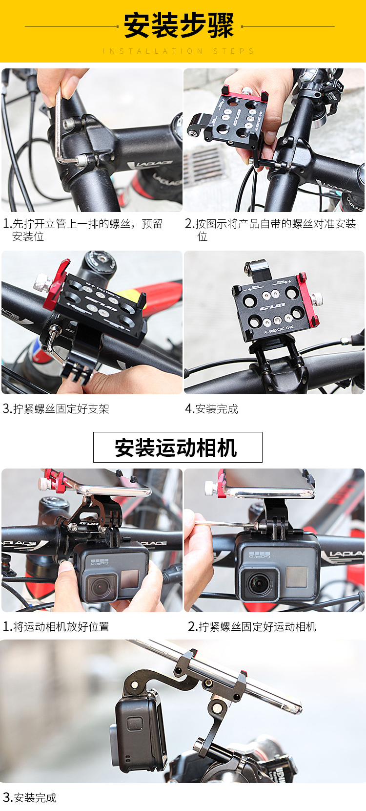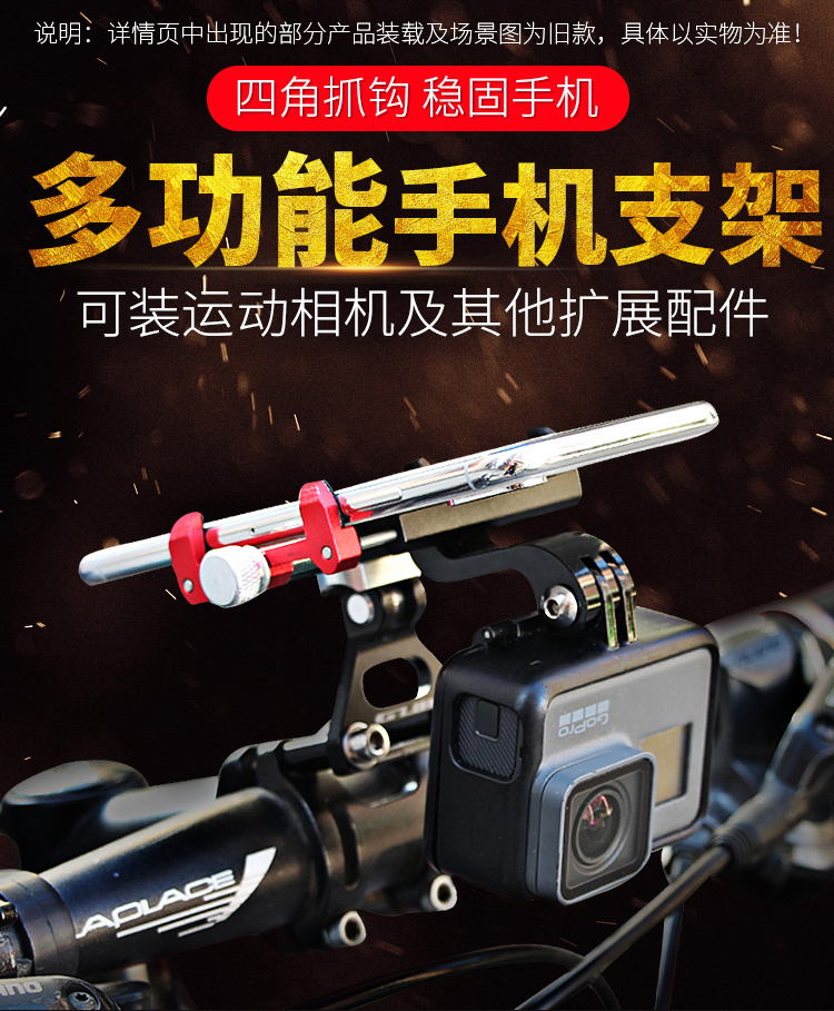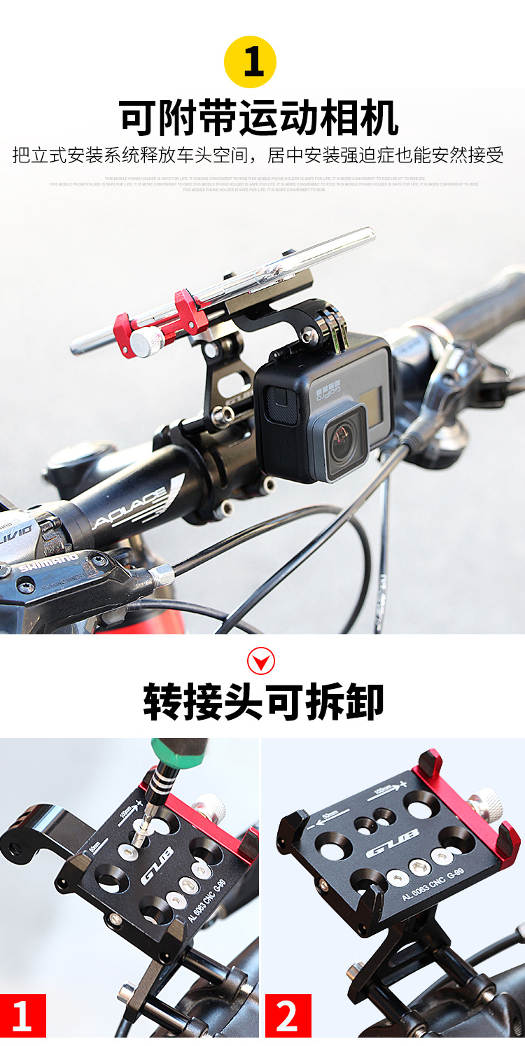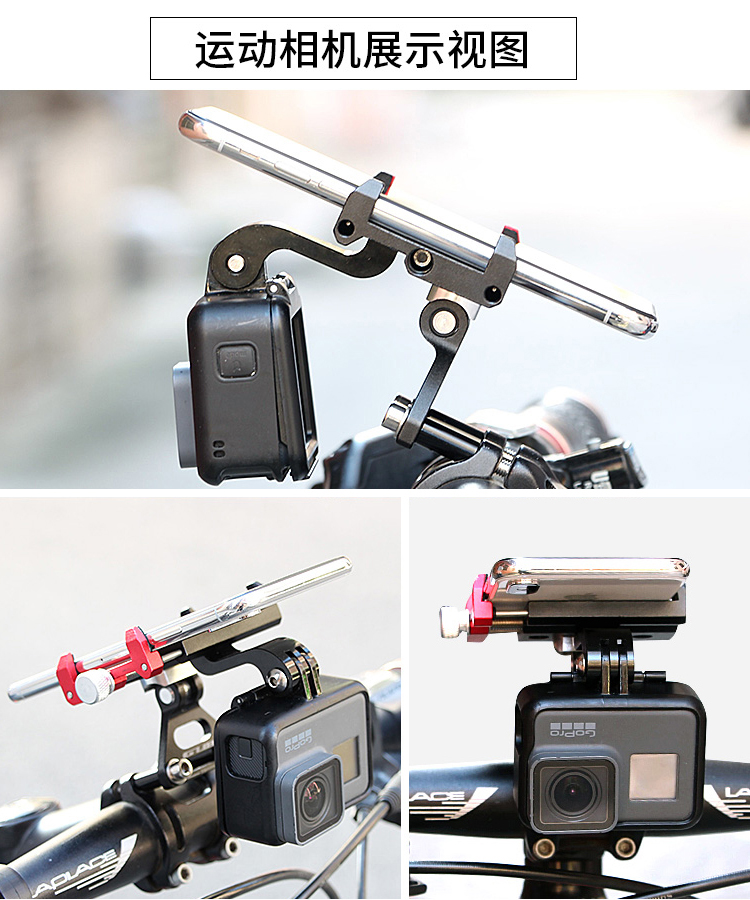 特點:全鋁合金架體,把立式安裝系統(釋放車頭空間,居中安裝強迫癥也能安然接受),可調節角度,附帶可拆卸運動相機轉接頭。
