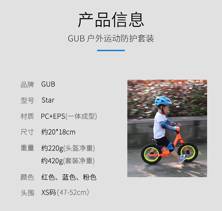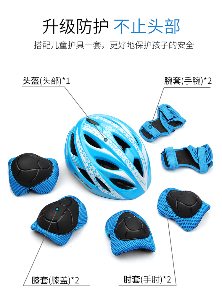 特色:兒童騎行戶外運動頭盔套裝,采用PC+EPS一體成型技術,更安全更貼心,同時頭盔尾部的反光標起到警示作用,讓孩子的夜騎更安全。另搭配兒童護具一套,貼心呵護孩子的安全!