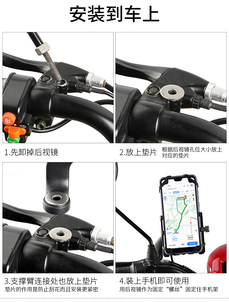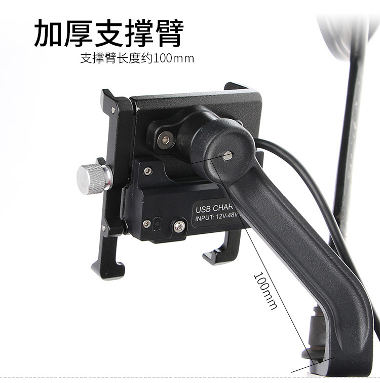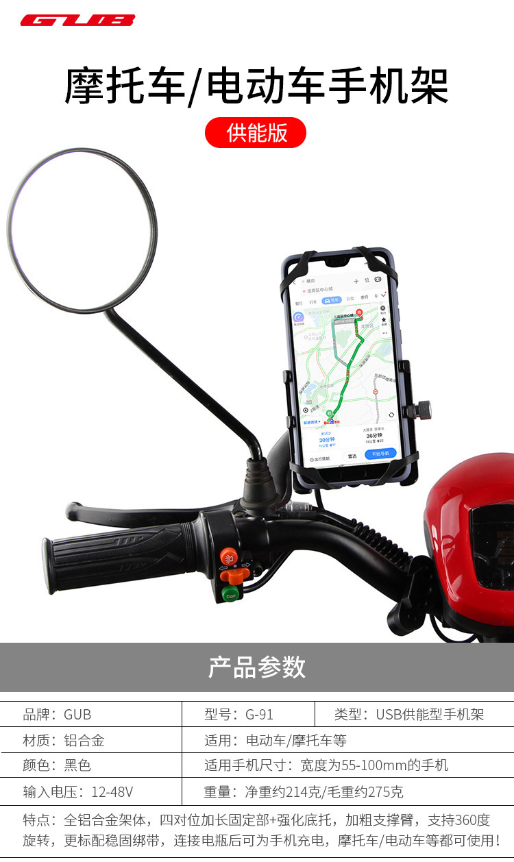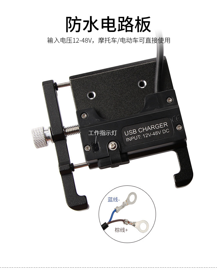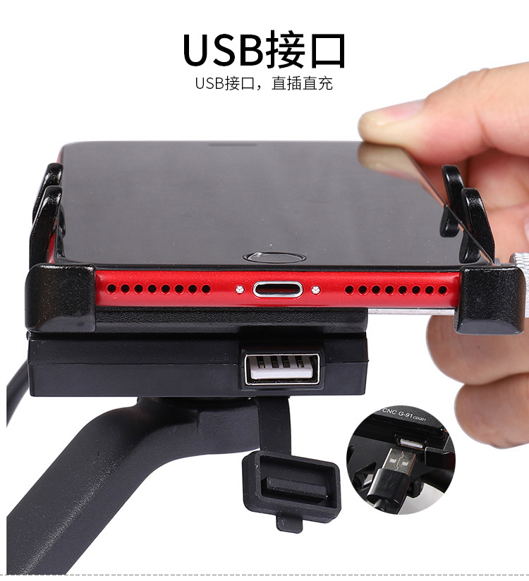 特點:全鋁合金架體,四對位加長固定部+強化底托,加粗支撐臂,支持360度旋轉,更標配穩固綁帶,連接電瓶后可為手機充電,摩托車/電動車等都可使用!