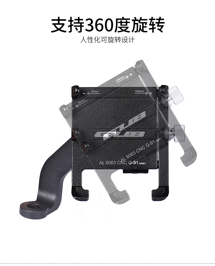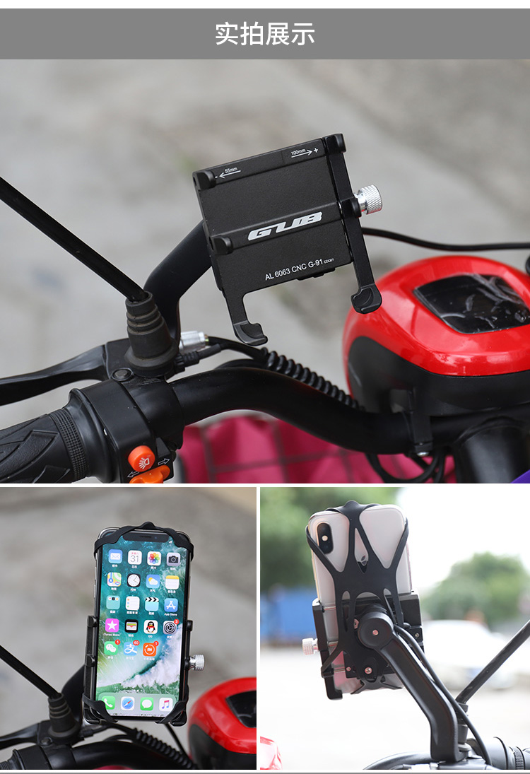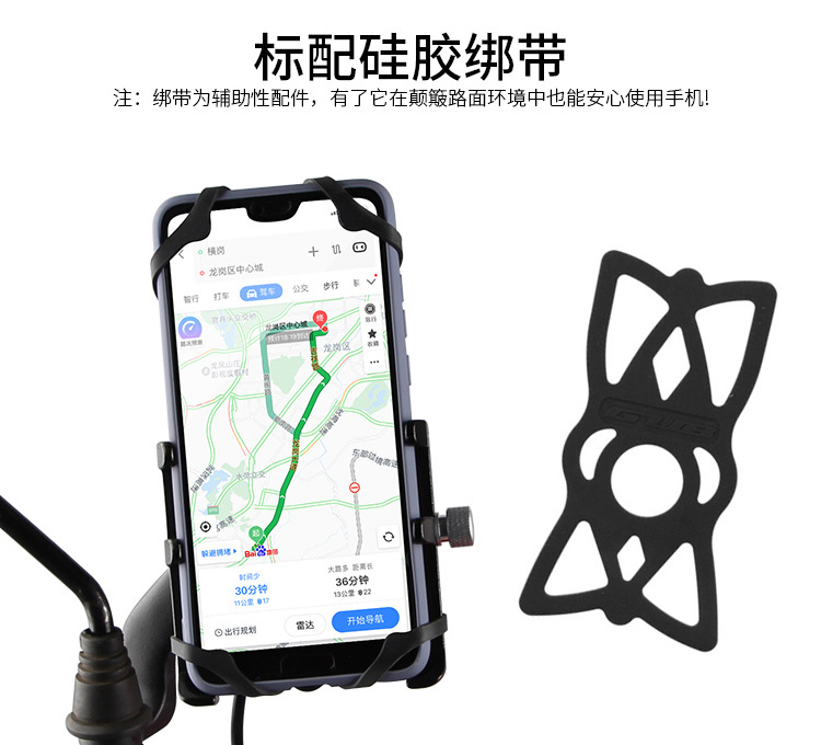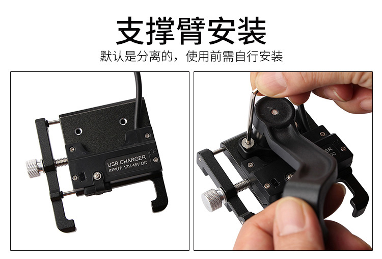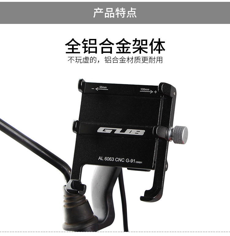 特點:全鋁合金架體,四對位加長固定部+強化底托,加粗支撐臂,支持360度旋轉,更標配穩固綁帶,連接電瓶后可為手機充電,摩托車/電動車等都可使用!