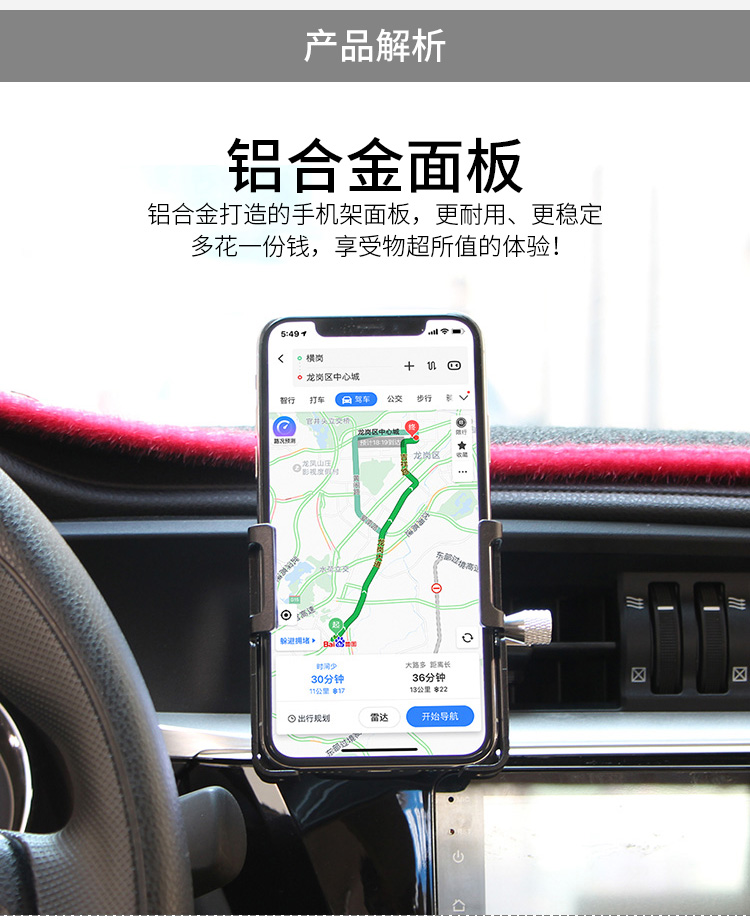 特點(diǎn):鋁合金架體+PC固定組件,55-100mm寬度的手機(jī)均可使用,萬(wàn)向球+可旋轉(zhuǎn)夾口讓使用更加隨心所欲!