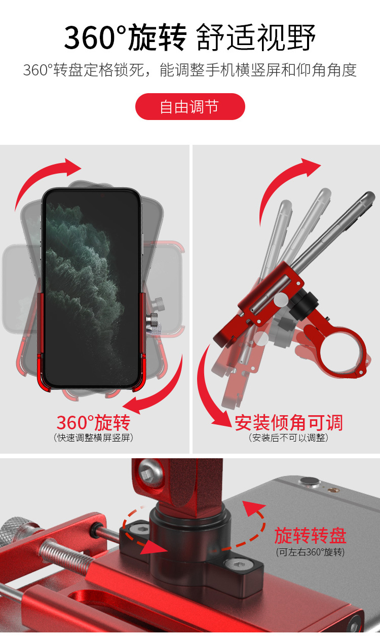 特點:鋁合金架體,高兼容性不挑手機型號,自行車、電動車等都可使用!