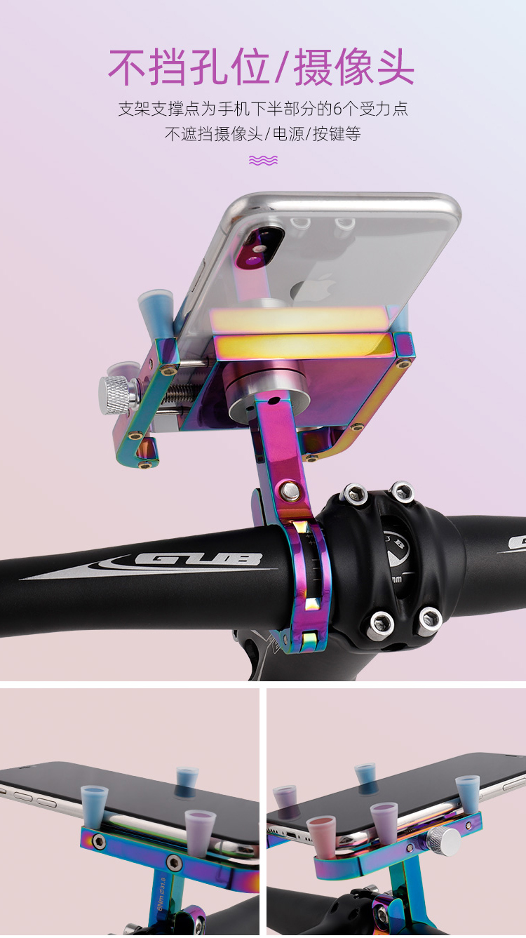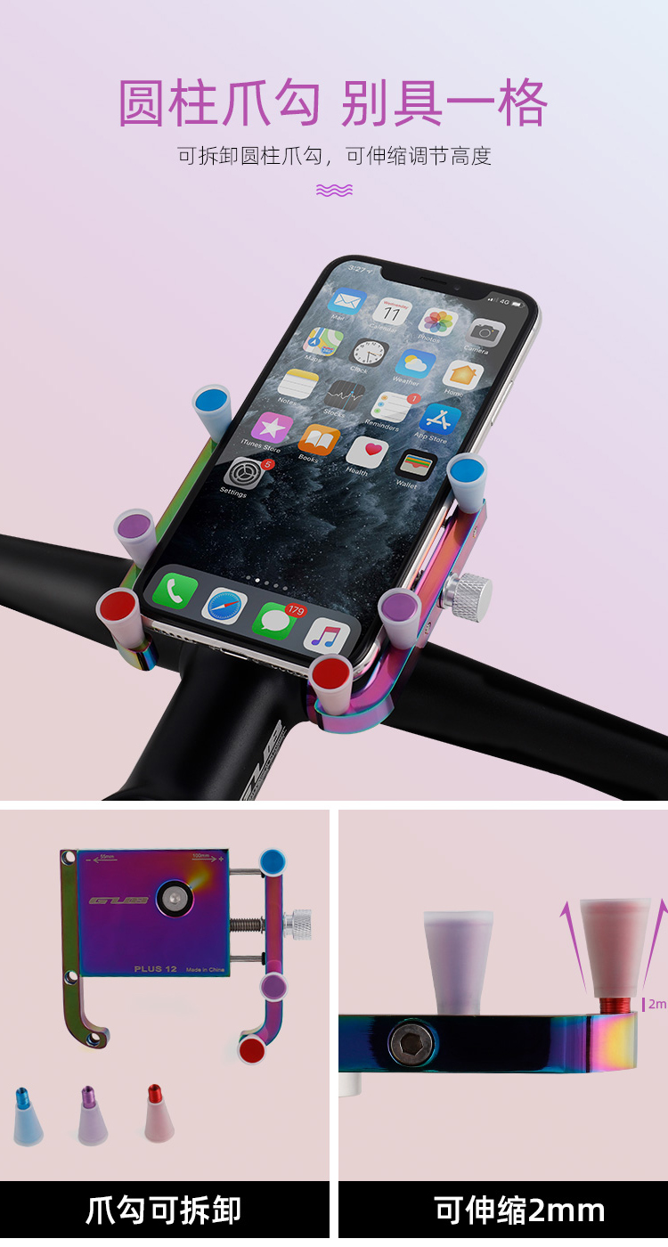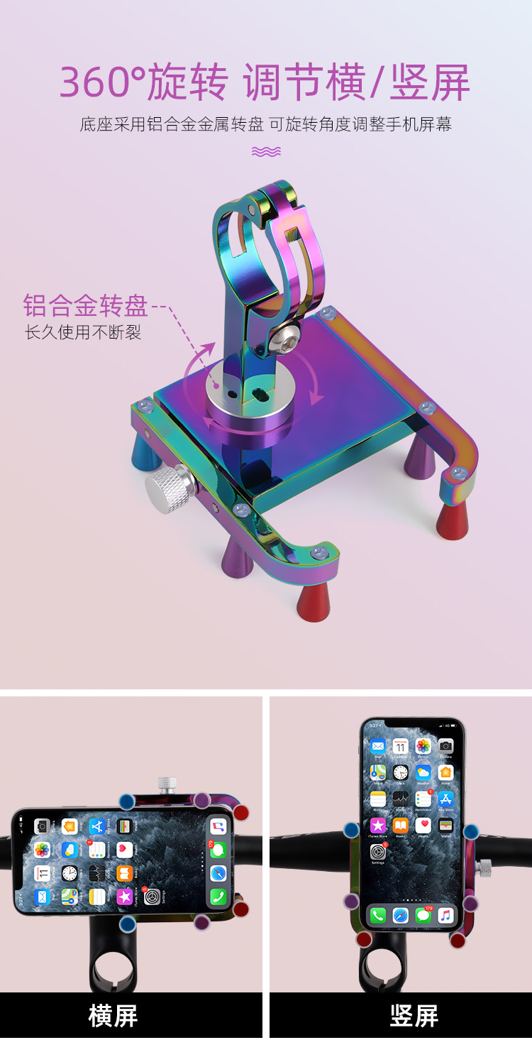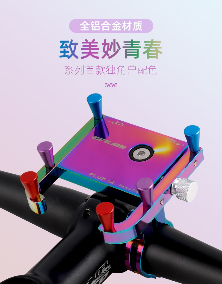 特點(diǎn):鋁合金架體,表面七彩電鍍工藝,帶來猶如夢幻獨(dú)角獸般的觀感,高兼容性不挑手機(jī)型號,自行車、電動車等都可使用!