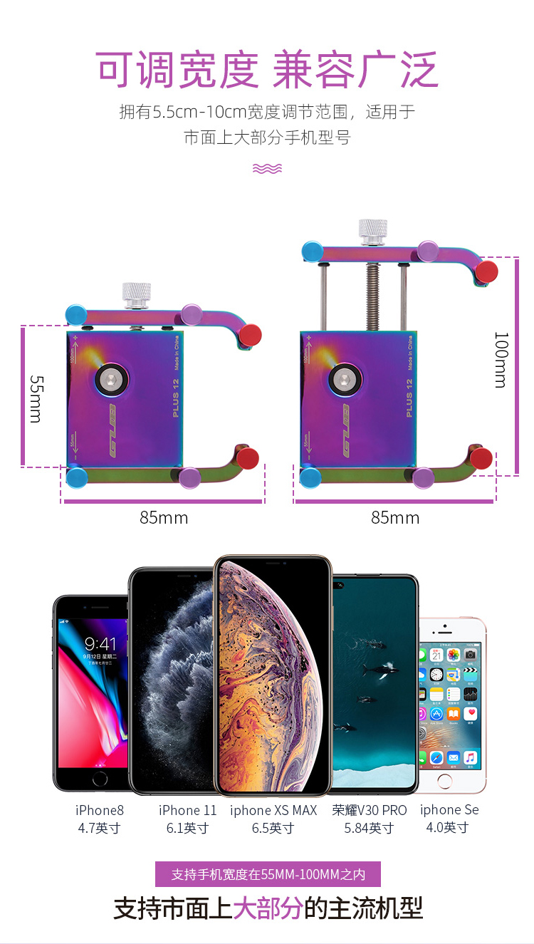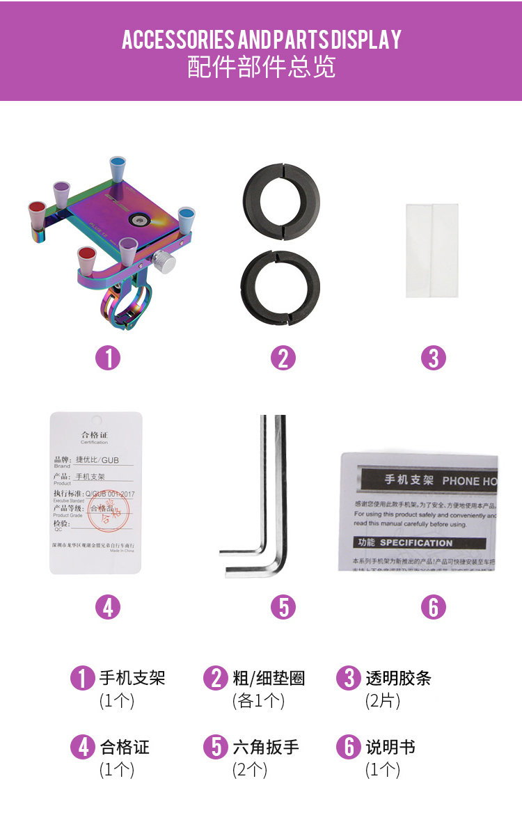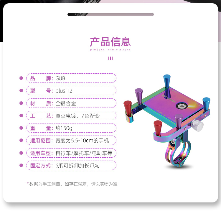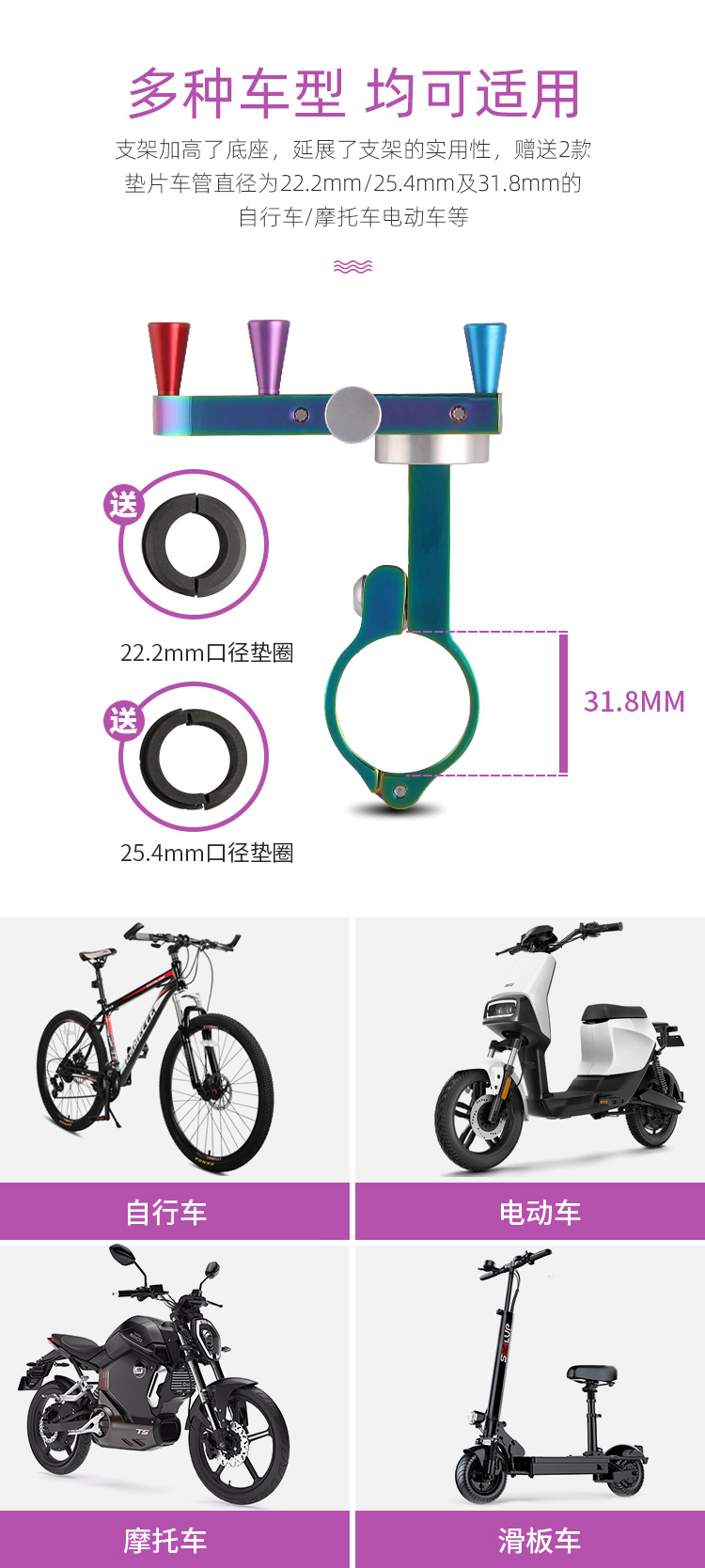 特點(diǎn):鋁合金架體,表面七彩電鍍工藝,帶來猶如夢幻獨(dú)角獸般的觀感,高兼容性不挑手機(jī)型號,自行車、電動車等都可使用!