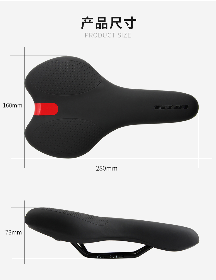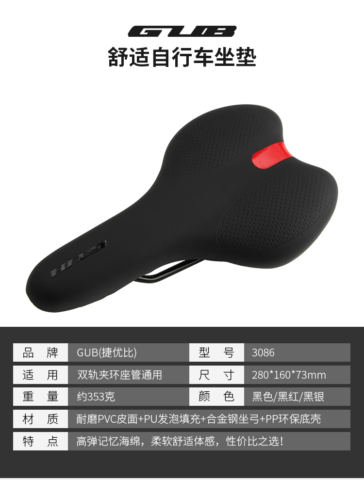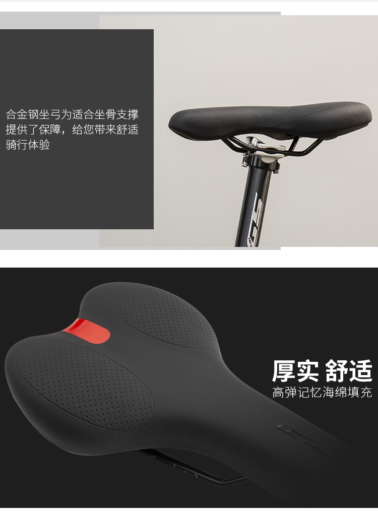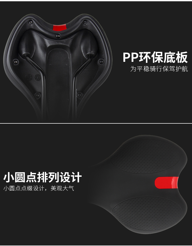 特色:高彈記憶海綿填充,舒適寬厚,合金鋼弓+PP底板,平穩輸出,安心騎行!