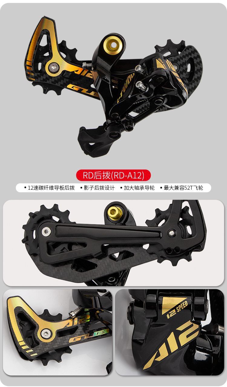 后撥:12速碳纖維導板后撥,影子后撥設(shè)計,加大軸承導輪,最大兼容52T飛輪