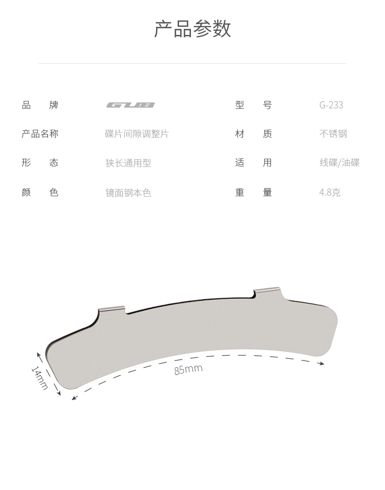 名稱:GUB G-233 碟片間隙調整片 材質:不銹鋼 適用:線碟/油碟 重量:凈重4.8克/毛重8克 統一零售價:5元