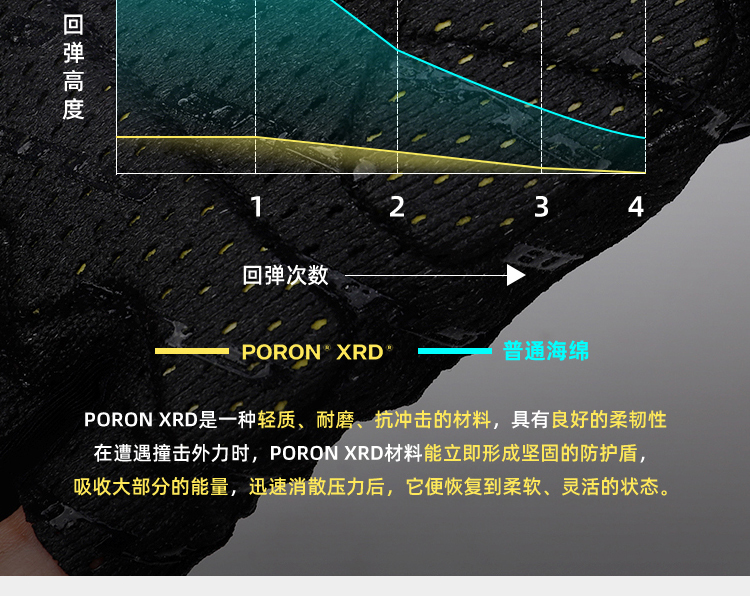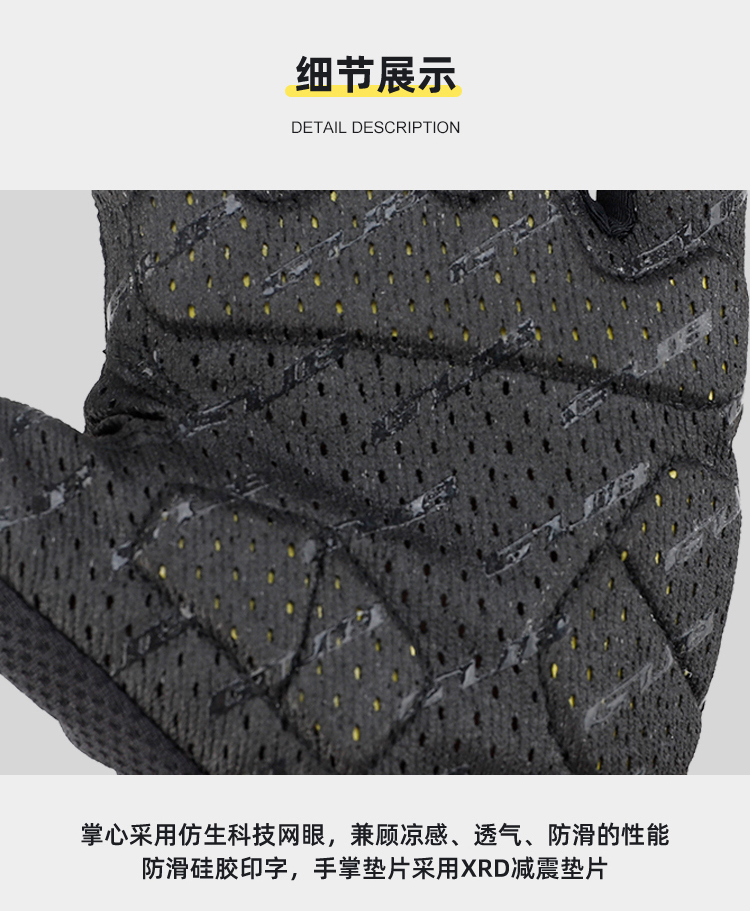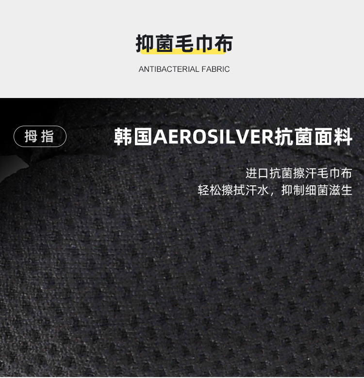 材質:華夫格高彈透氣面料、進口PORON XRD 緩沖掌墊、掌心采用仿生科技網眼、韓國Aerosilver抗菌面料(擦汗布)