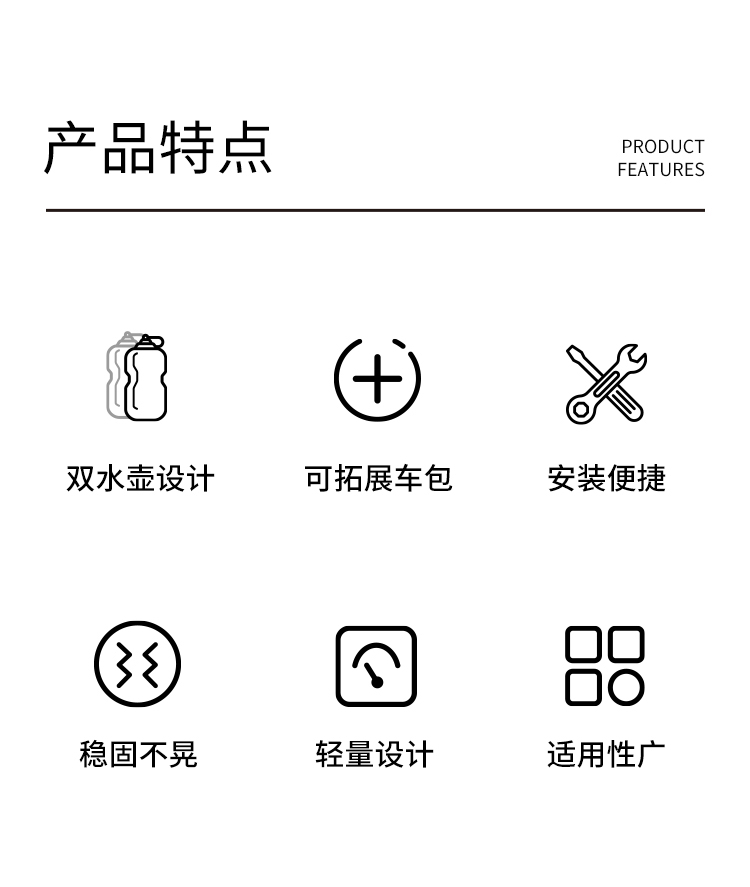 特點:單/雙水壺架兩種模式,輕量化設計,可拓展車尾包,安裝便捷