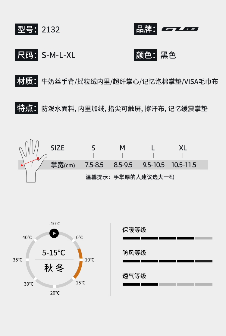 特點:內里加絨,抵御寒風,柔軟舒適,3D立體裁剪,防滑耐磨,支持觸屏