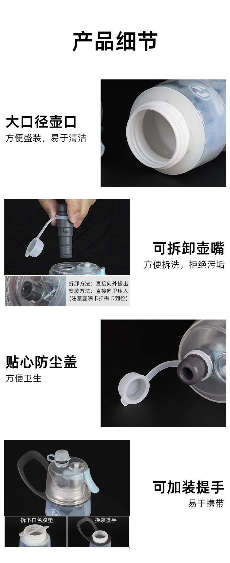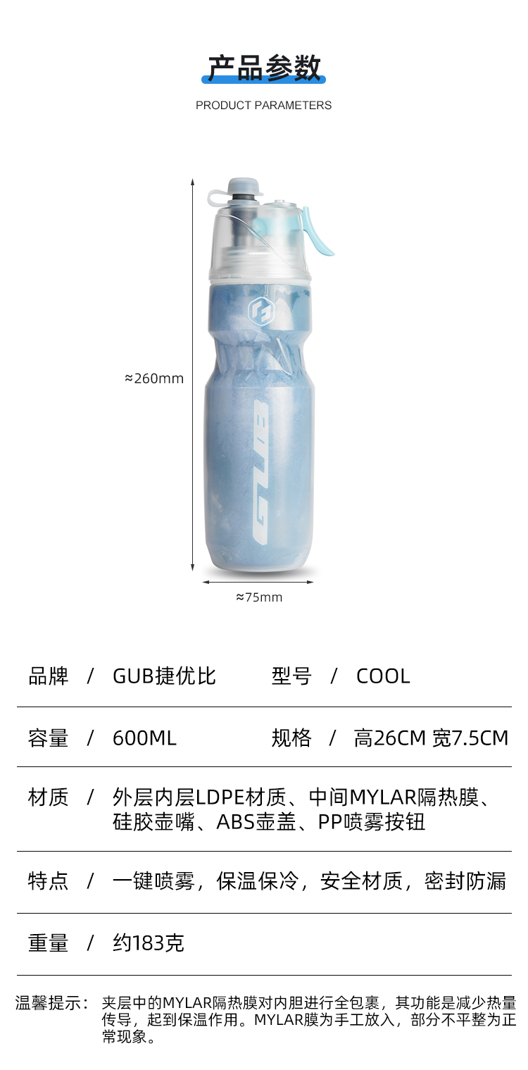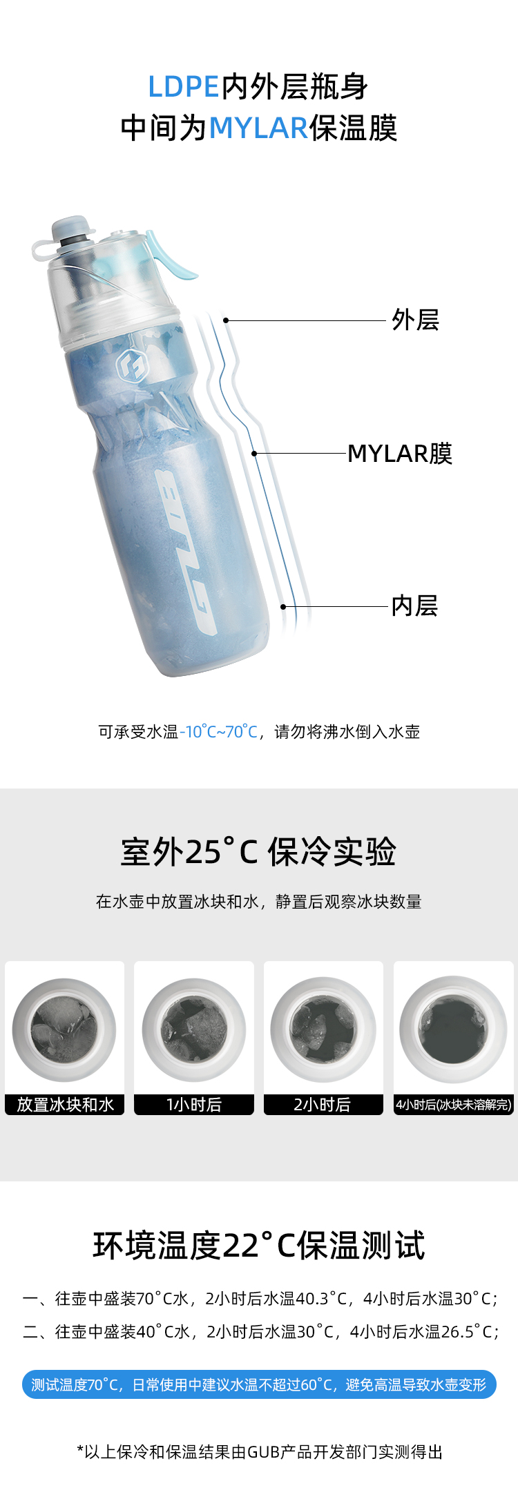 材質:外層內層LDPE材質、中間MYLAR隔熱膜、硅膠壺嘴、ABS壺蓋、PP噴霧按鈕