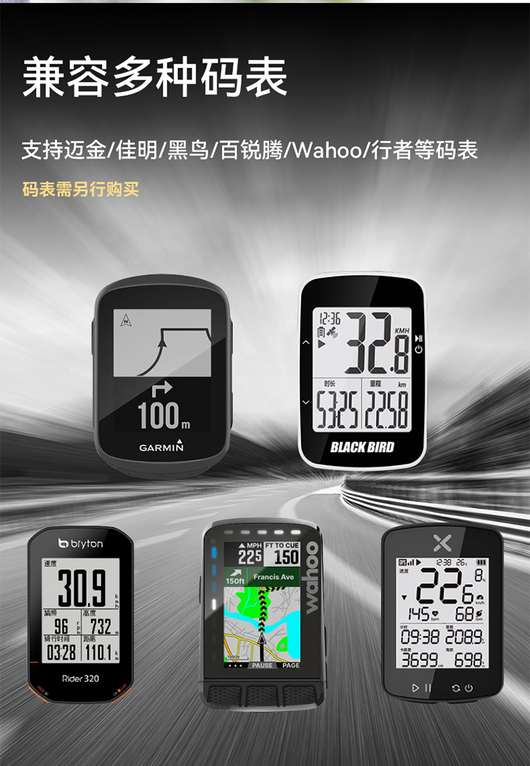 支持碼表:GARMIN全系列(兼用行者/黑鳥/iGPS等),貓眼全系列,百銳騰系列,wahoo系列